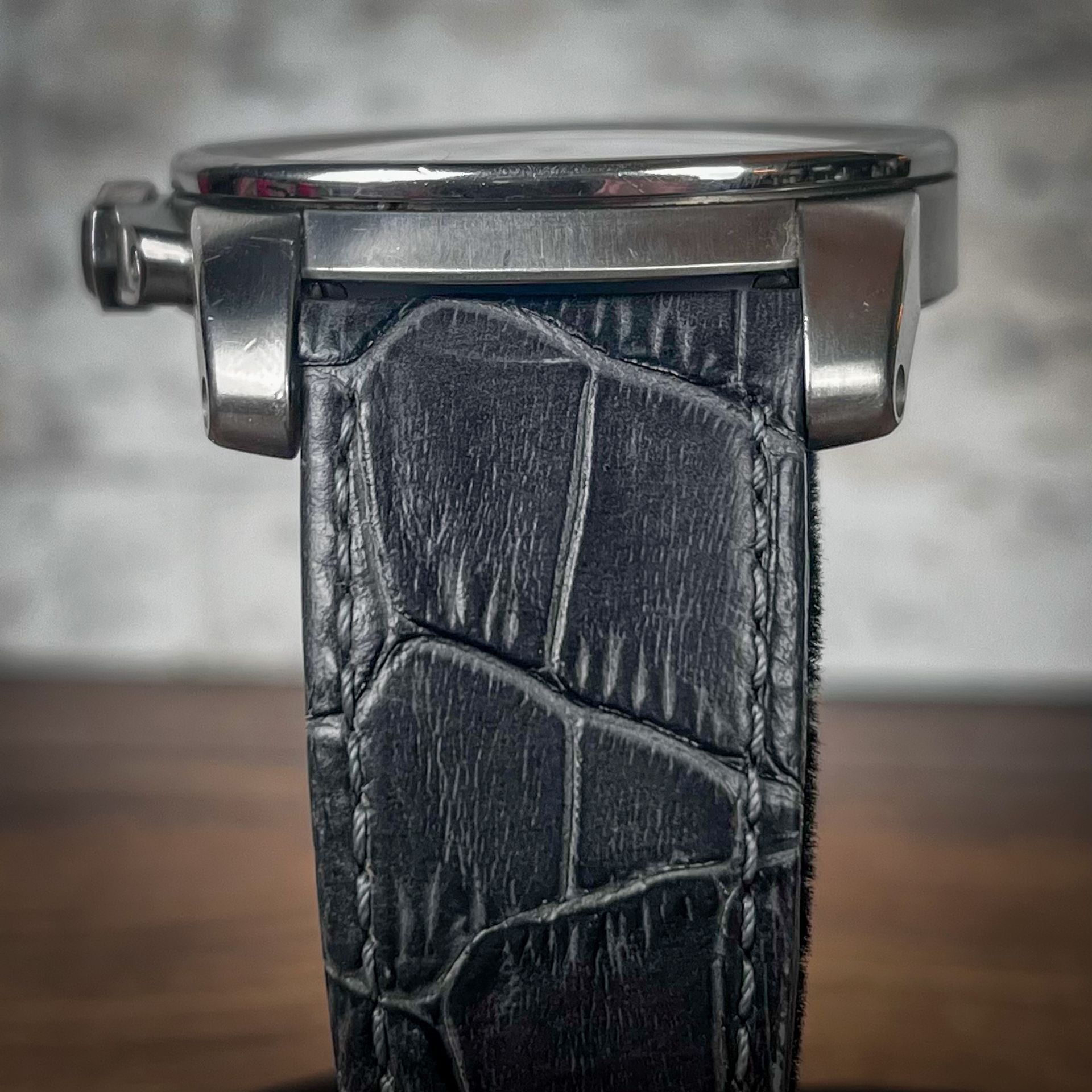 The watch is in good overall condition with moderate signs of wear throughout the case. The dial and crystal are flawless. The factory black strap is in great condition with signs of seldom wear. The grey aftermarket strap has been the main strap on the piece and shows it.