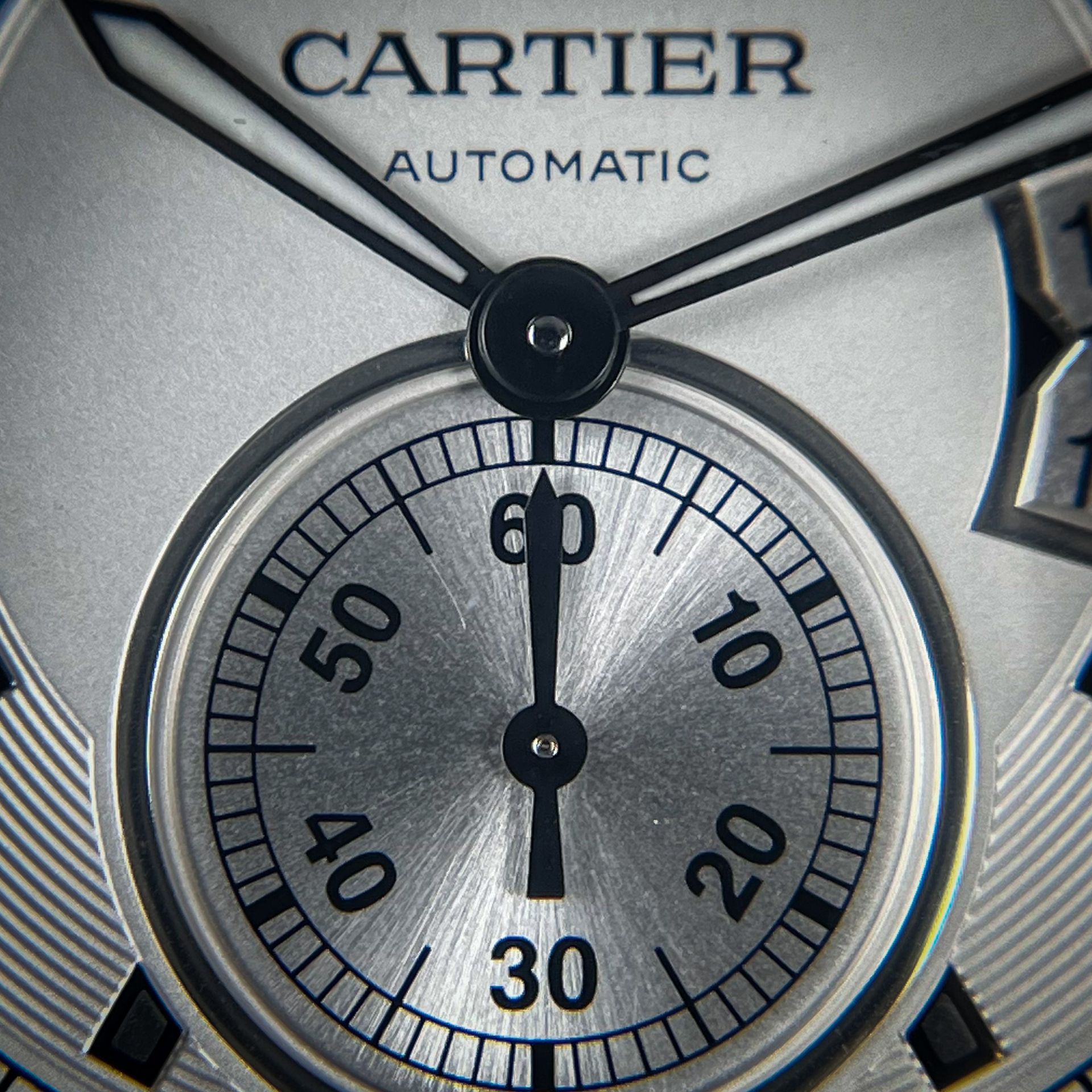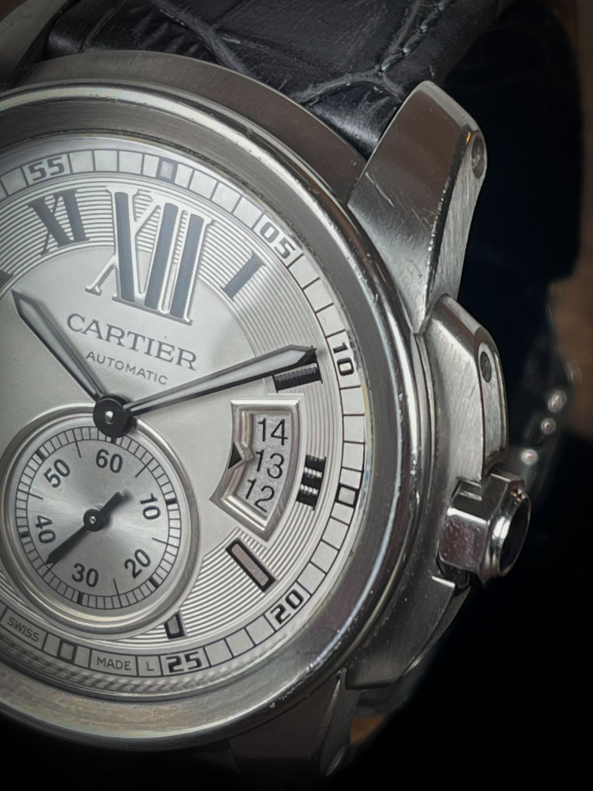 Introducing the Cartier Calibre de Cartier in white. The 42mm case gives this dressier piece a massive wrist presence. The unorthodox date aperture makes this one stick out from the crowd. The combination of brushed and polished finishing on this makes it catch the light in stunning ways.