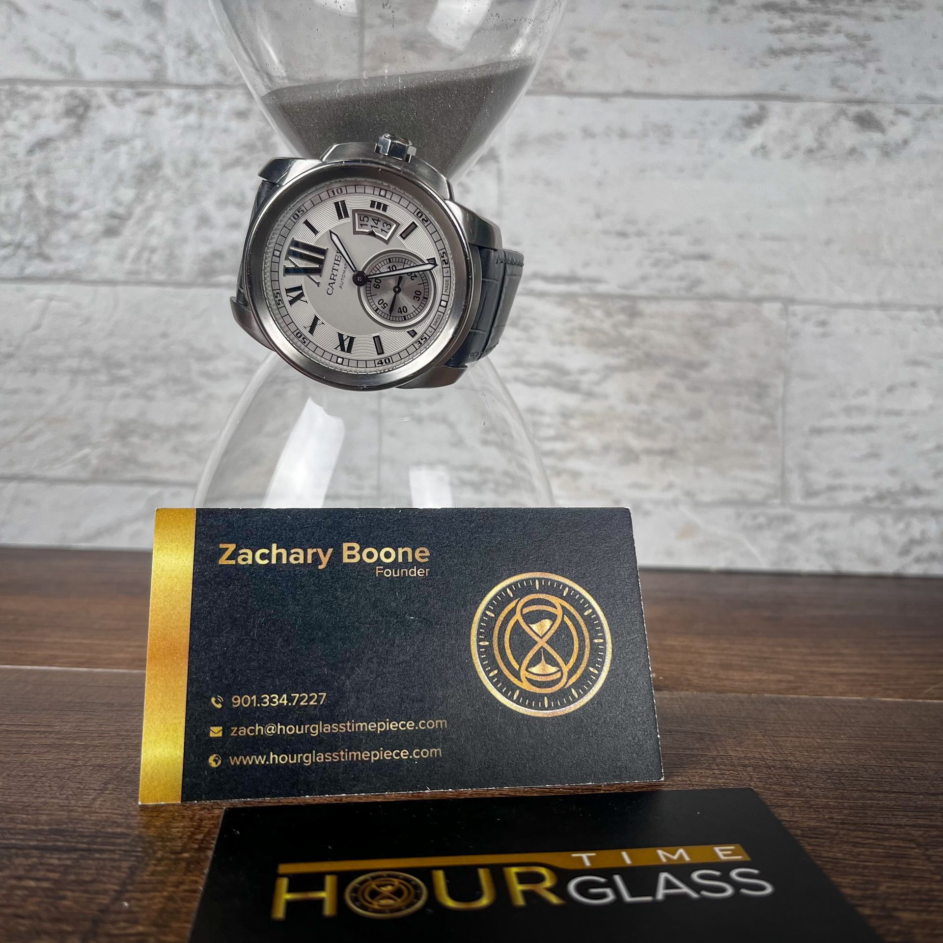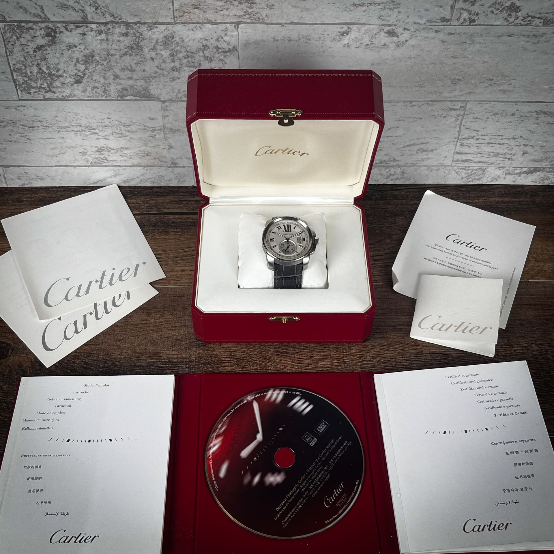 This will come as a set with original red Cartier box, books, the original black alligator strap, and an aftermarket grey alligator strap. The warranty guarantee is dated 2015.