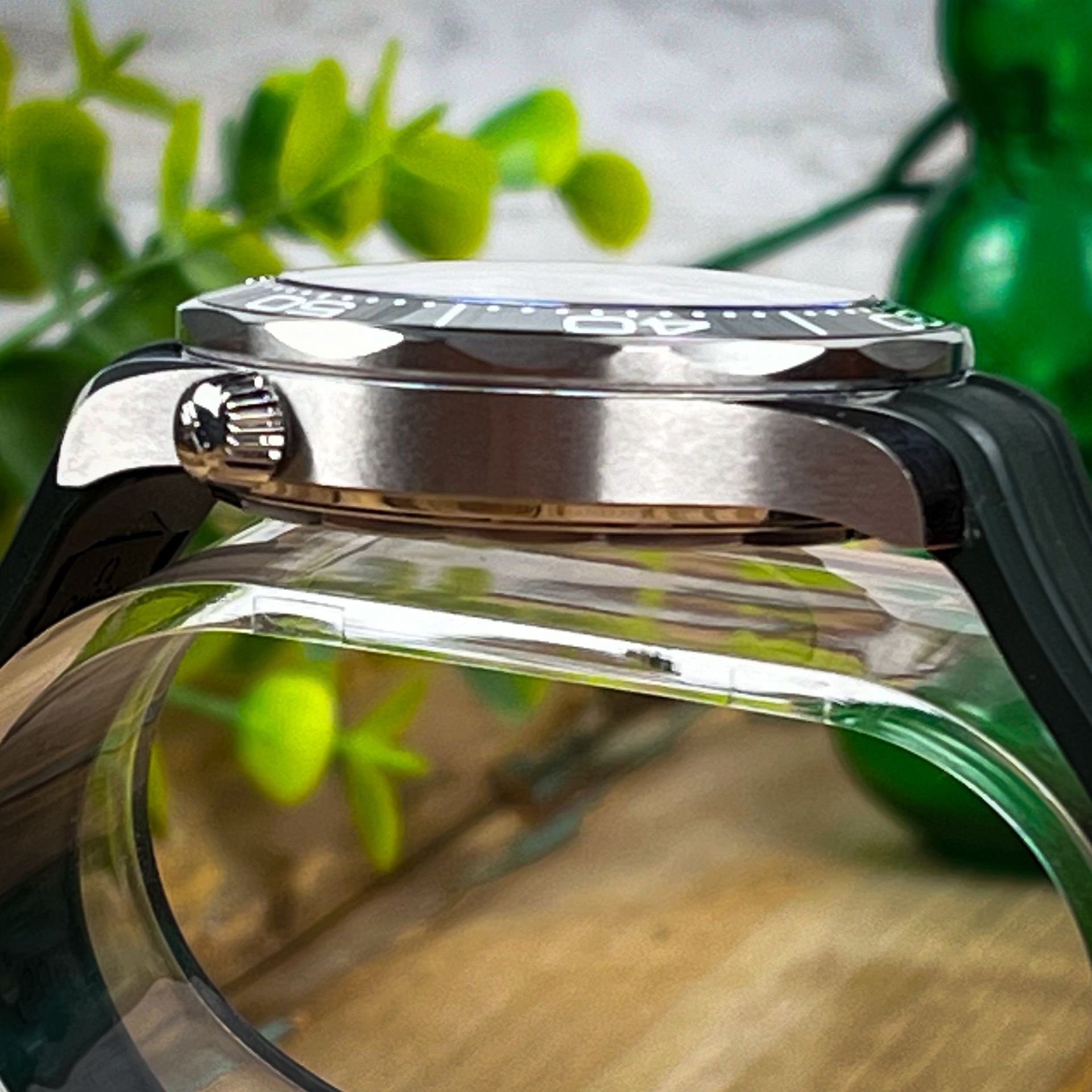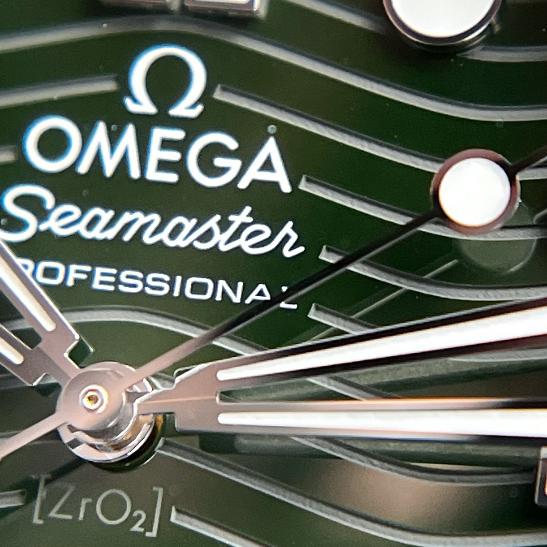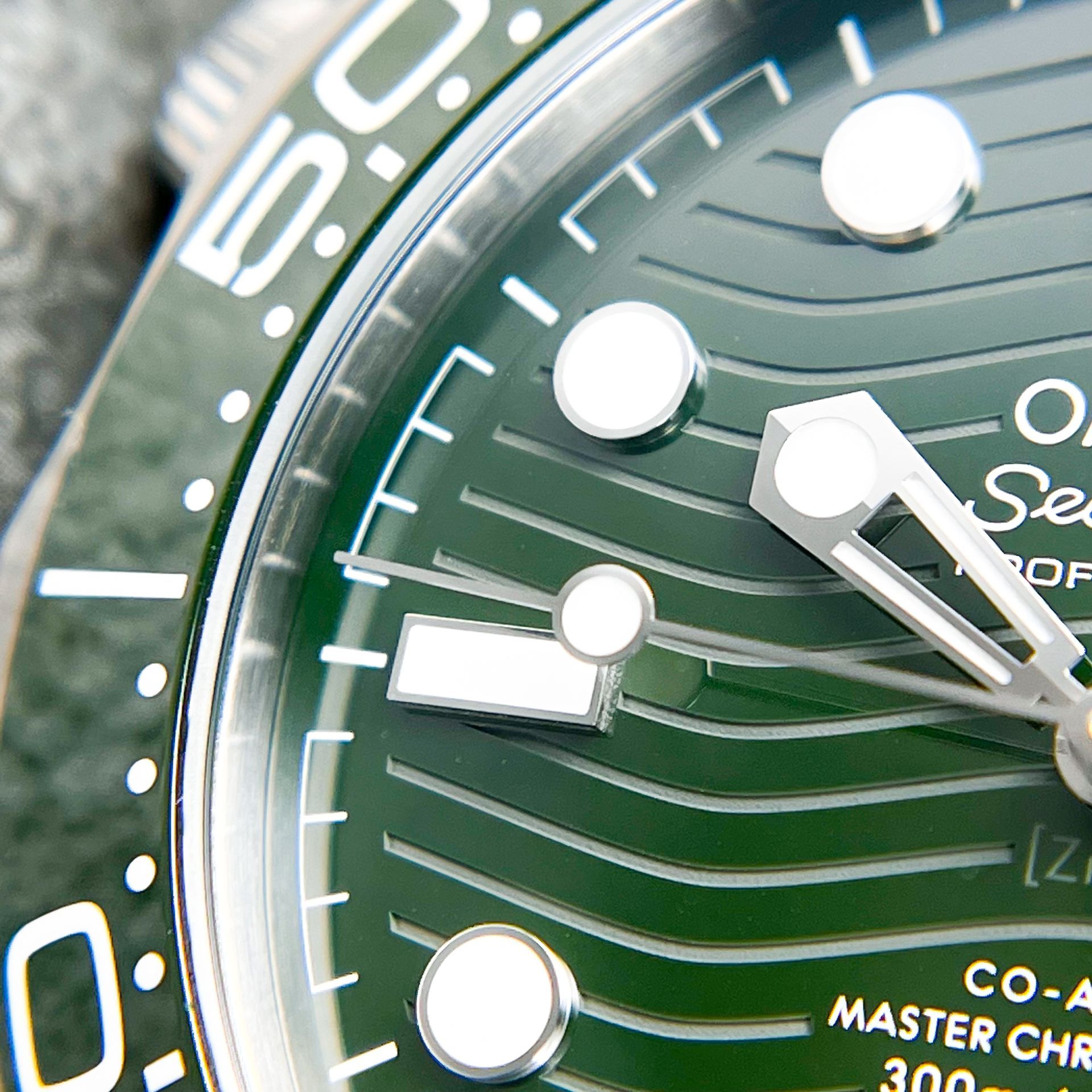 This 42 mm model is crafted from stainless steel and includes the gorgeous green ceramic bezel with a white enamel diving scale. The dial is also polished green ceramic and features laser-engraved waves and a date window at 6 o’clock.