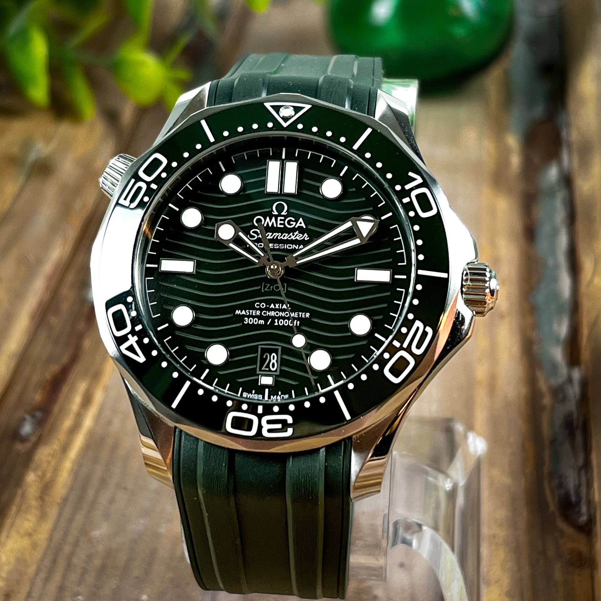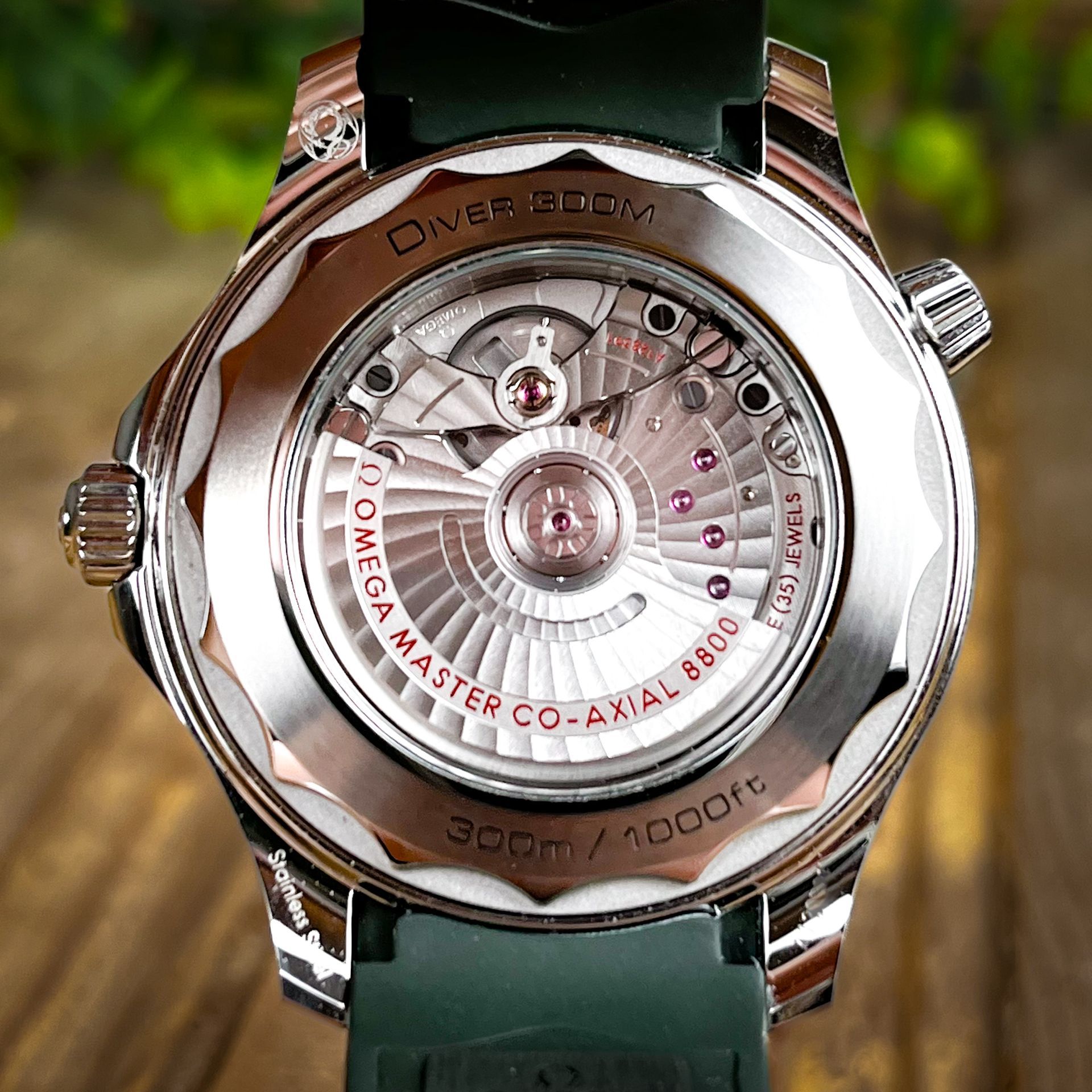 The watch is presented on a green rubber strap and is driven by the OMEGA Master Chronometer Calibre 8800, which can be seen through the sapphire-crystal on the wave-edged case back.