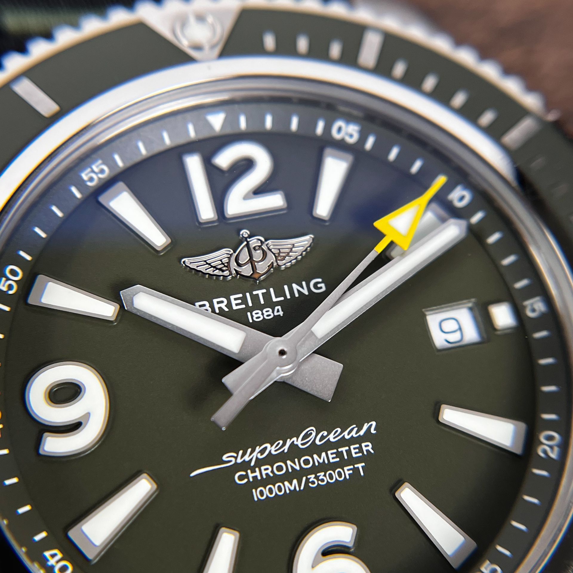 This model is a little bit more special. This is the Outerknown edition. Outerknown is professional surfing icon, Kelly Slater’s, clothing brand. As such, this model is an exclusive matte green that is striking. The SuperOcean collection was first introduced in 1957 and has since become an iconic series known for its durability, precision, and functionality, making it a favorite among diving enthusiasts and professionals alike.