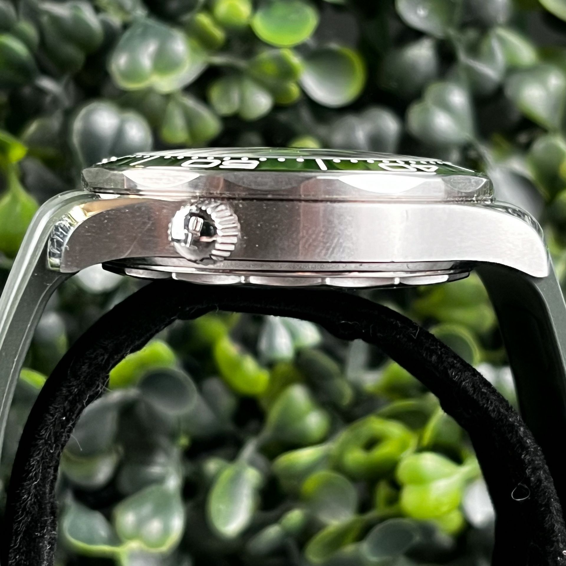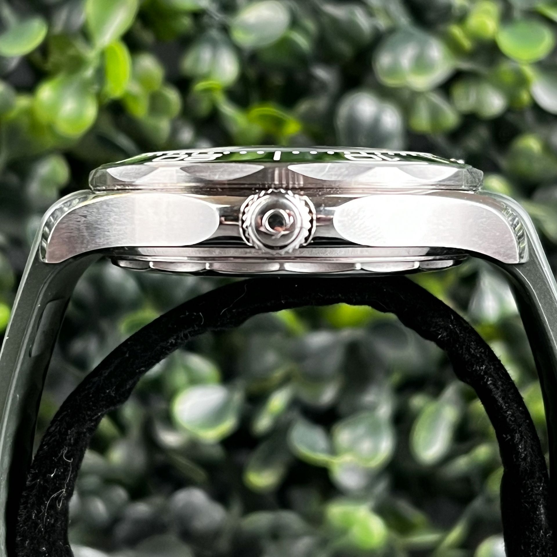 This 42 mm model is crafted from stainless steel and includes a black ceramic bezel with a white enamel diving scale. The dial is also polished black ceramic and features laser-engraved waves and a date window at 6 o’clock.