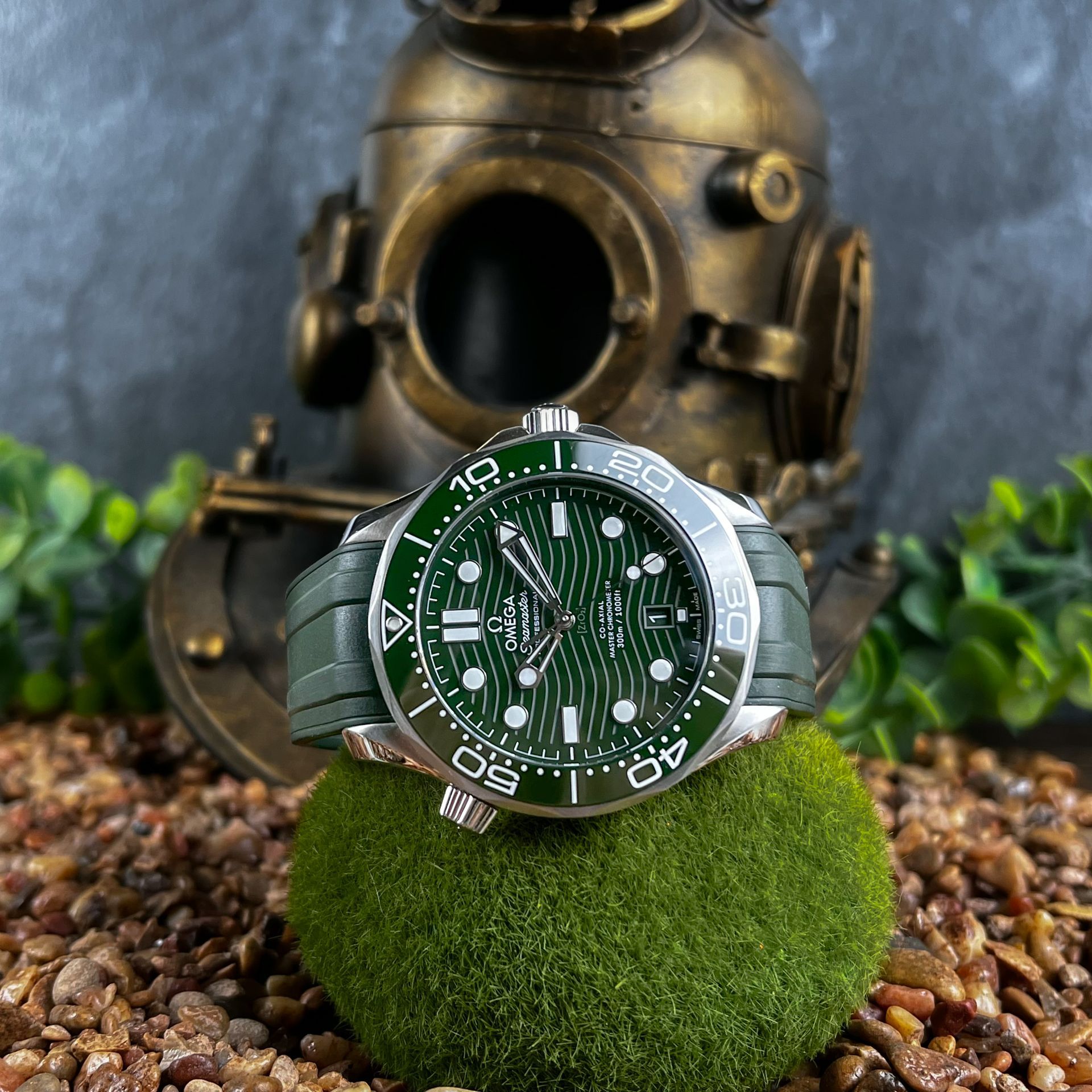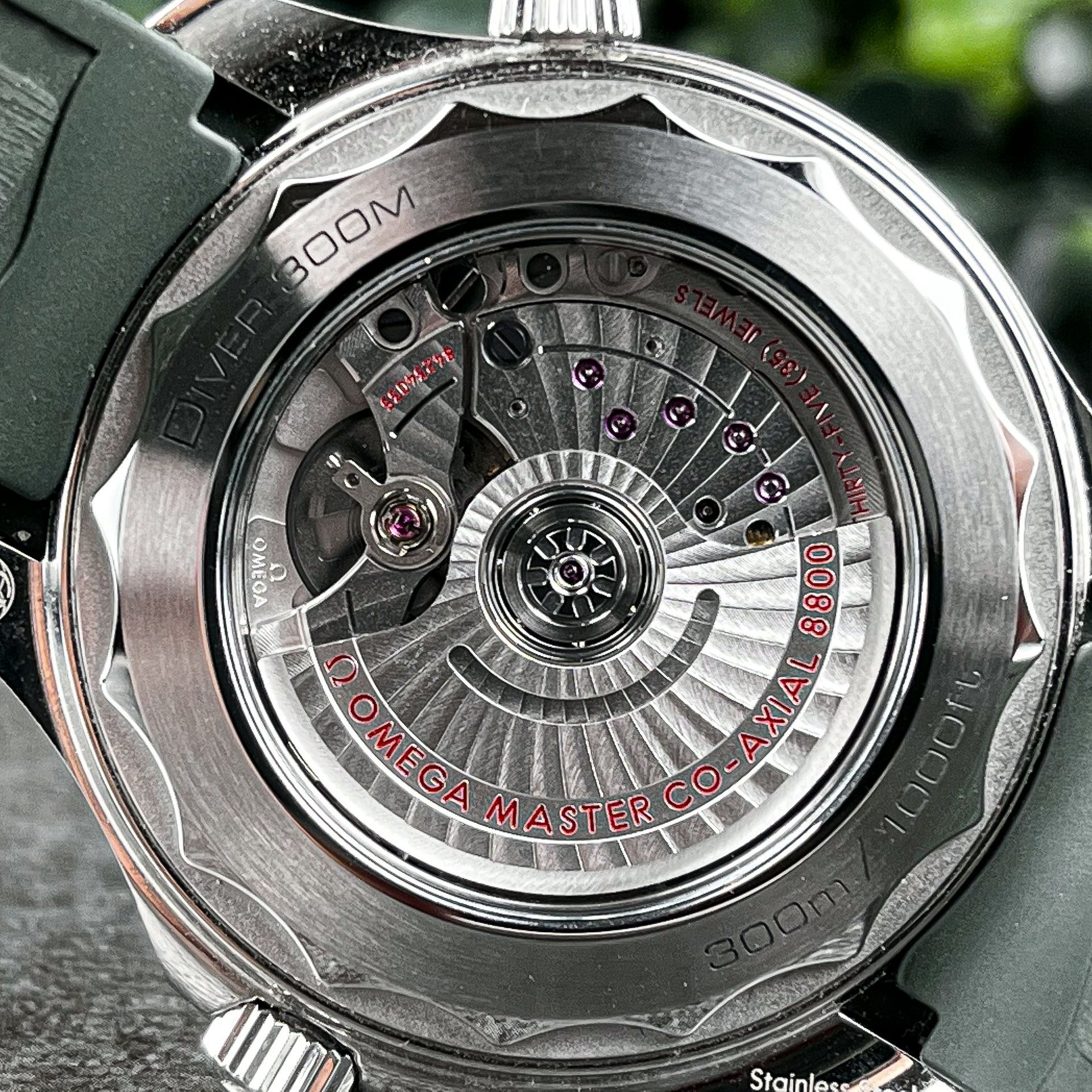 The watch is presented on a black rubber strap and is driven by the OMEGA Master Chronometer Calibre 8800, which can be seen through the sapphire-crystal on the wave-edged case back.