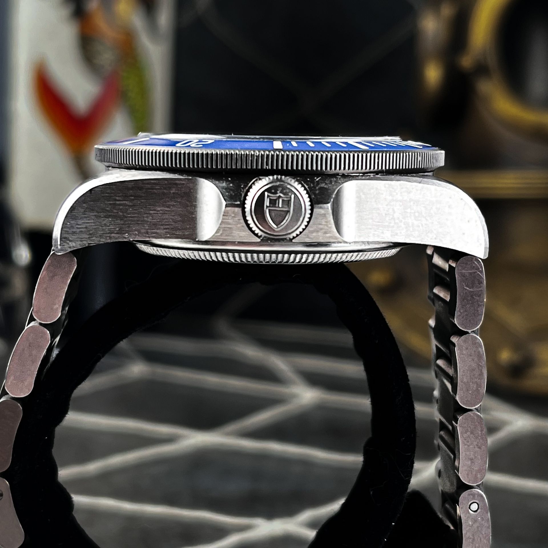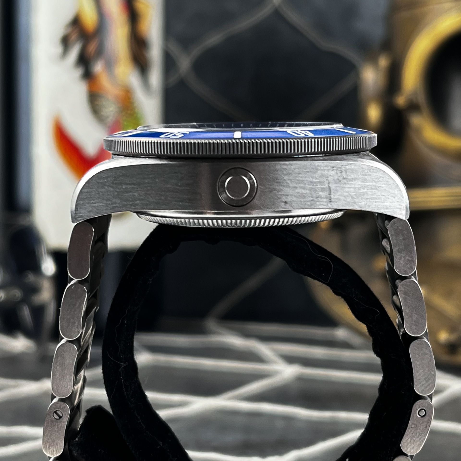 This example comes in a stunning matte blue color schema that really pops on the wrist. The titanium case is tough but light. The lume on this piece shines bright ensuring that you can always read the time regardless of low light conditions.