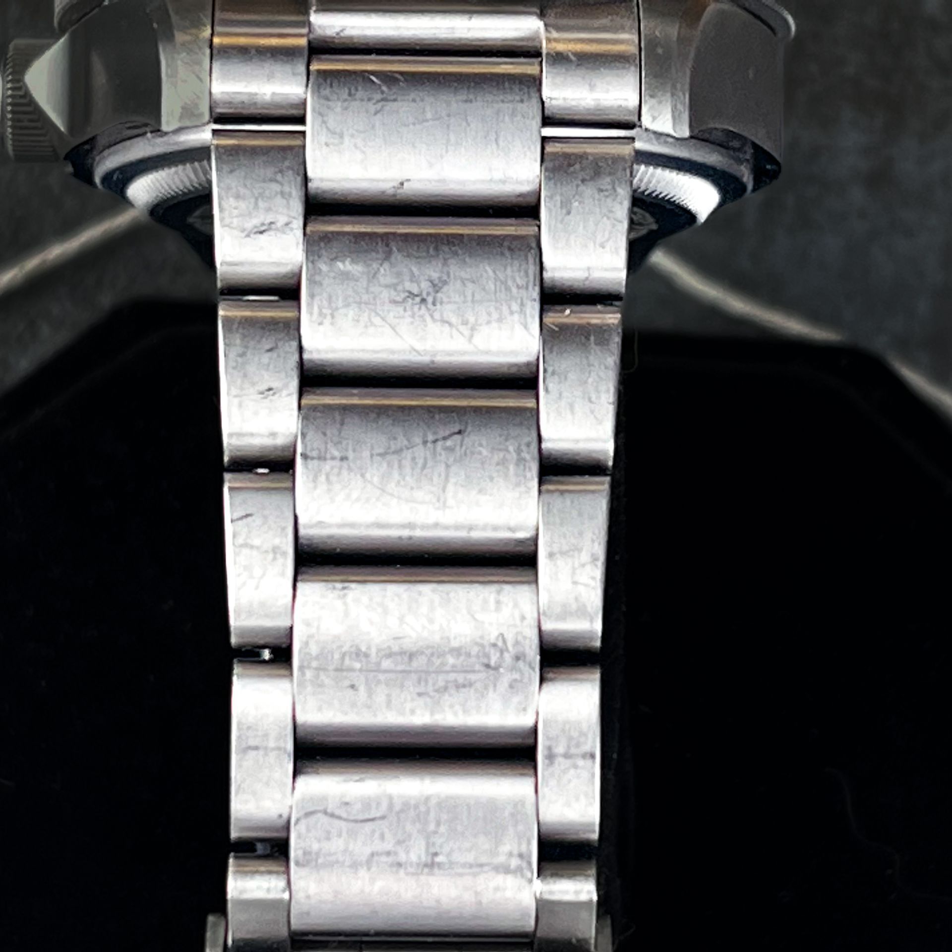 This example is in good condition with minor scratching to the titanium patina. A light polish would eliminate the majority of the scratching. There is minor scuffing to the bezel indicative of frequent wear. The crystal and dial are flawless.