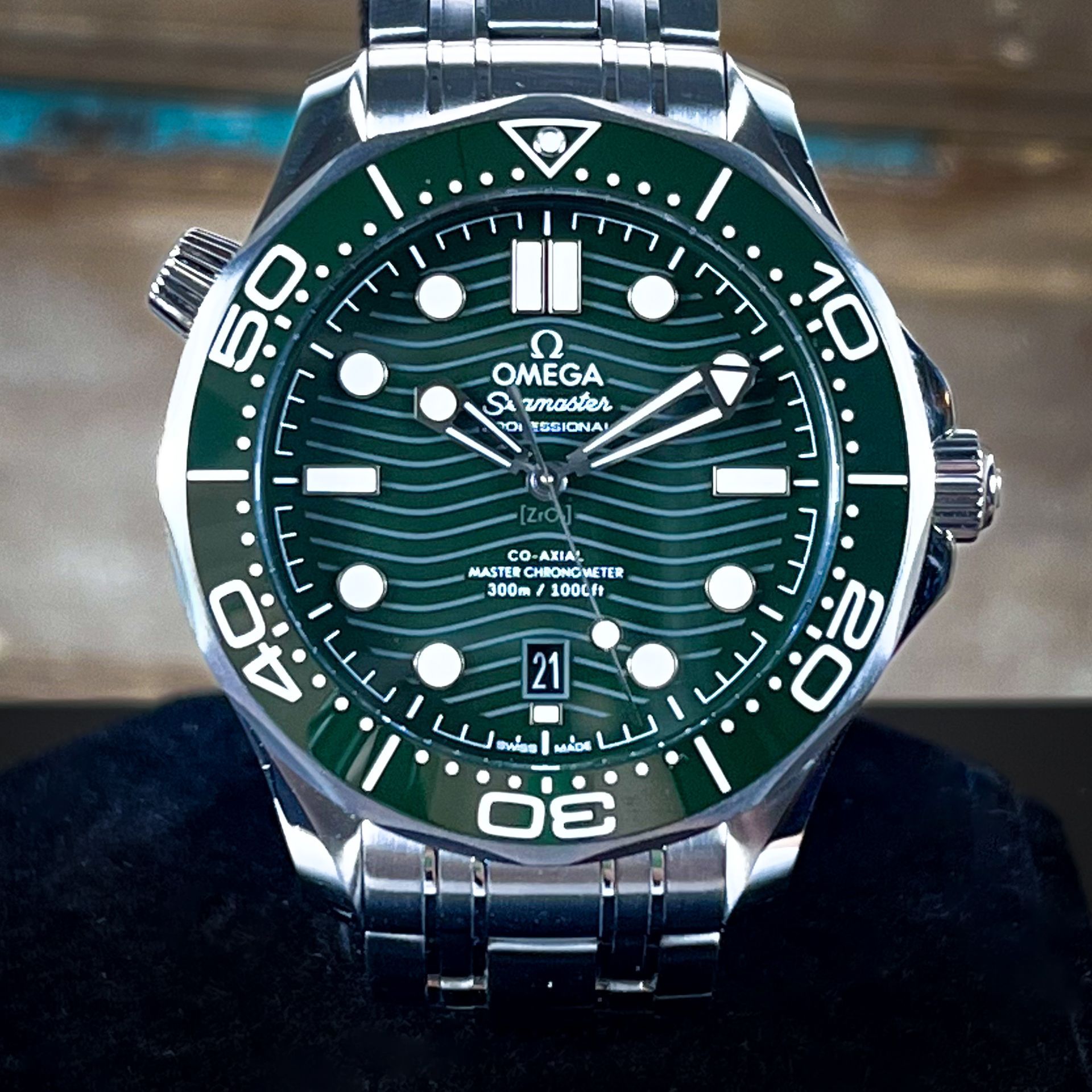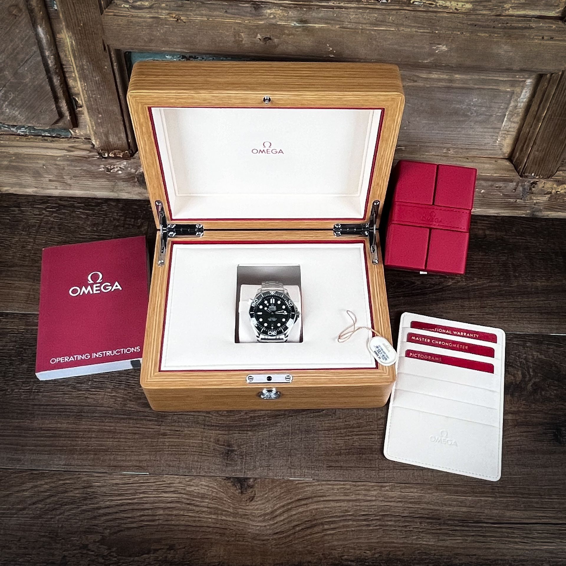 The watch is keeping good time with no deviations of note. All functions work as designed. This piece comes in excellent used condition. It will come as a complete set including white outer Omega box, new style wooden box with red travel case insert (very desirable), warranty card dated 6/26/2023, chronometer and pictogram cards, Omega manual, and serialized hang tag.