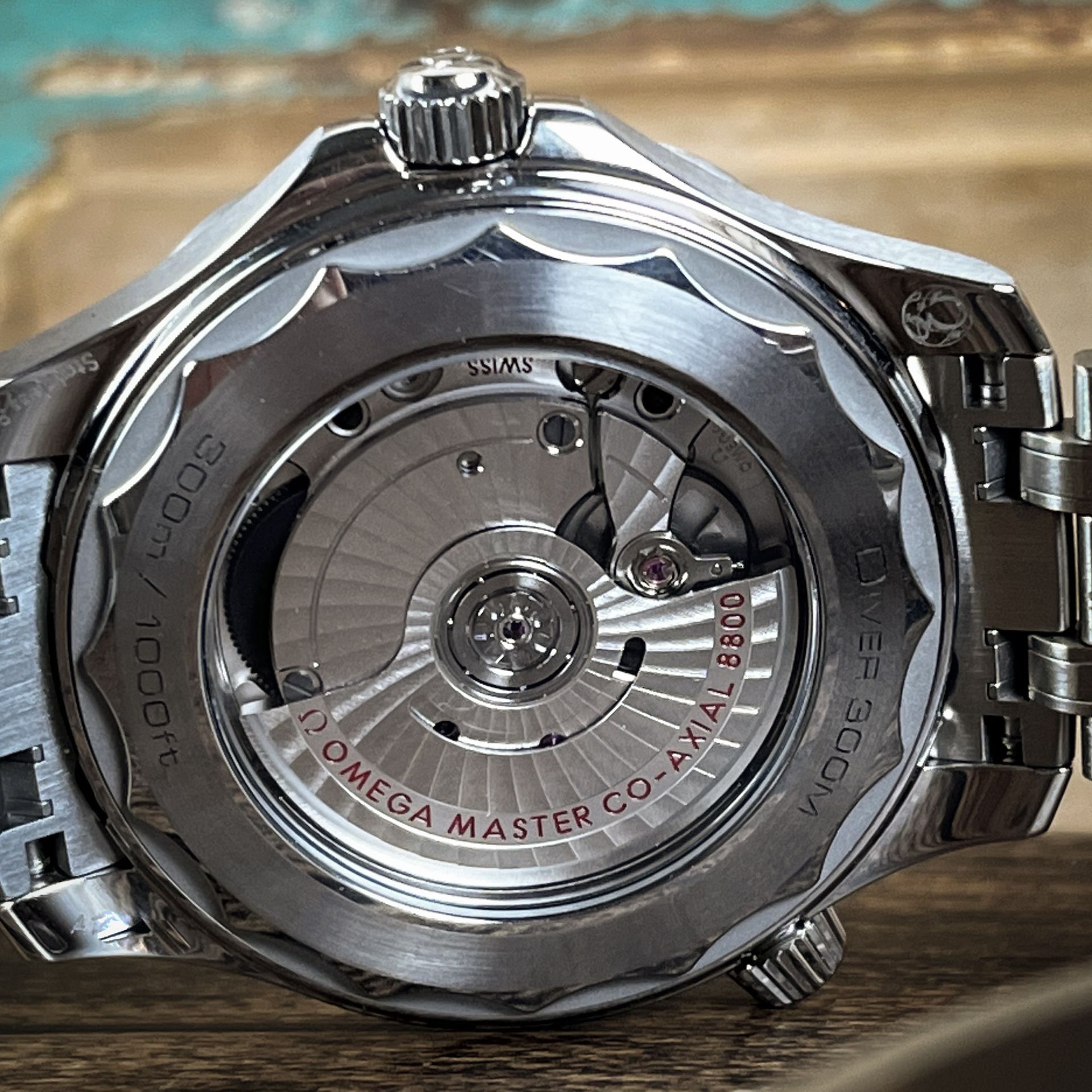 The watch is presented on a stainless steel bracelet with micro adjustable dive extension and is driven by the OMEGA Master Chronometer Calibre 8800, which can be seen through the sapphire-crystal on the wave-edged case back.