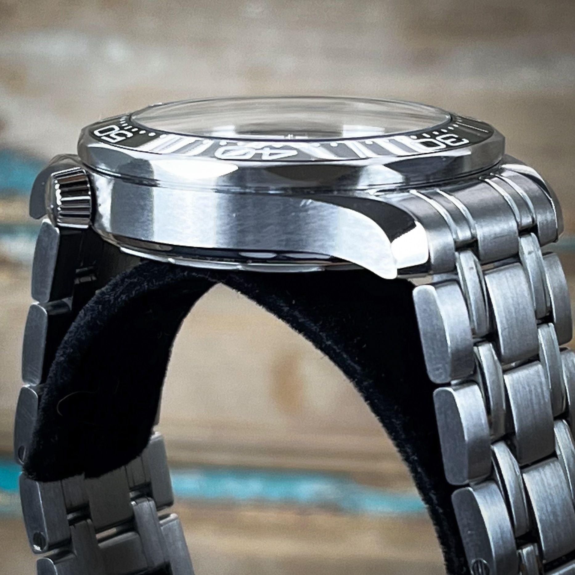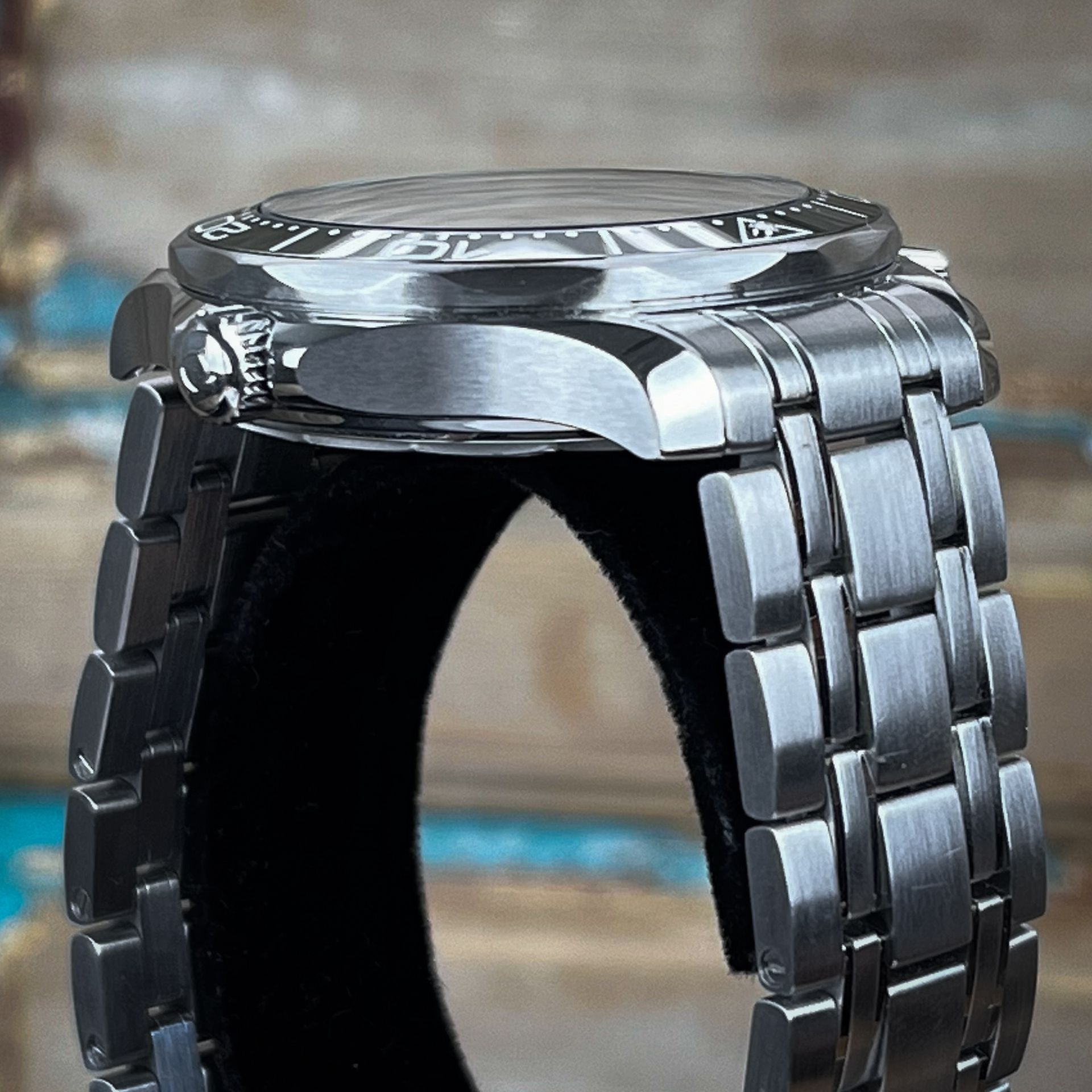 This 42 mm model is crafted from stainless steel and includes a green ceramic bezel with a white enamel diving scale. The dial is also polished black ceramic and features laser-engraved waves and a date window at 6 o’clock.