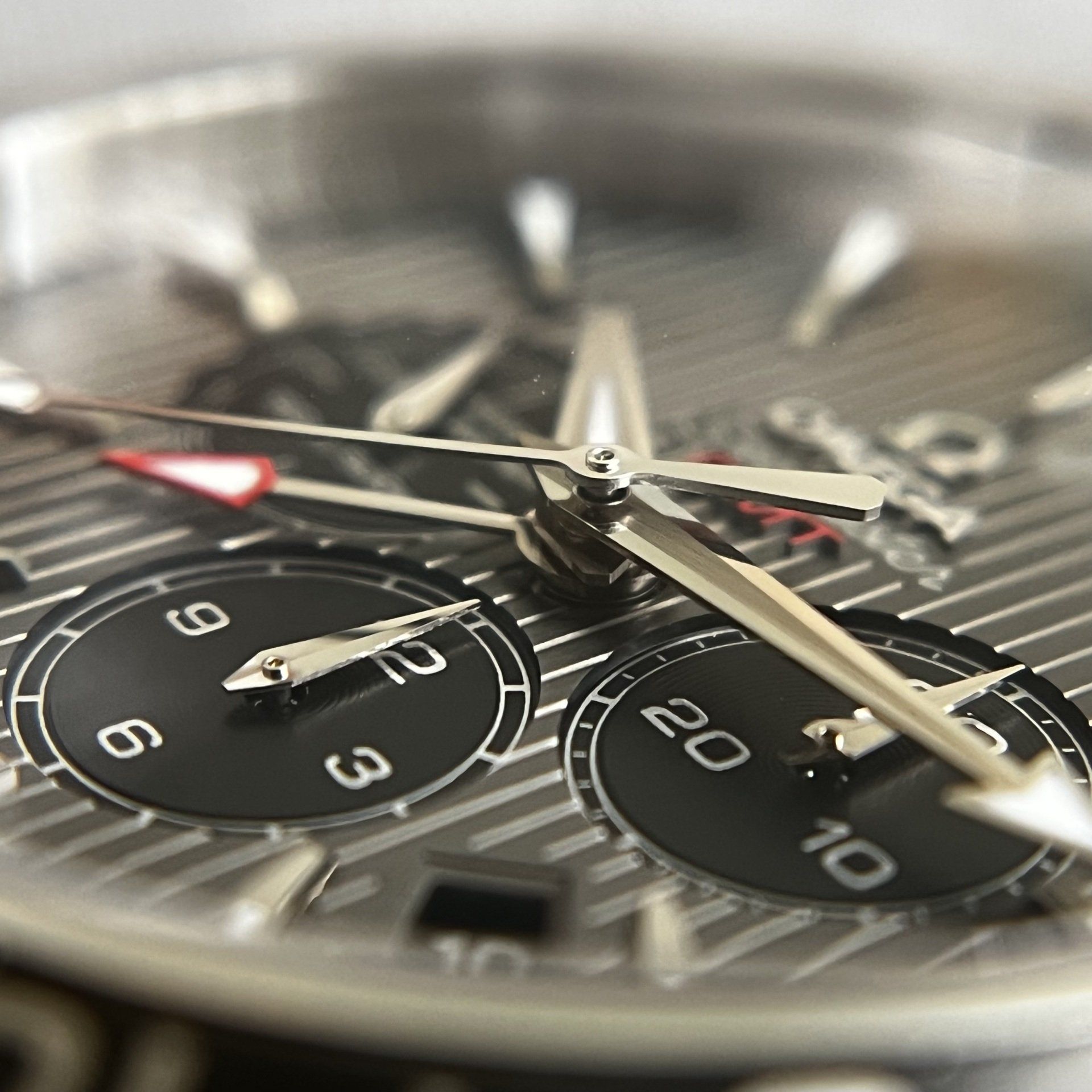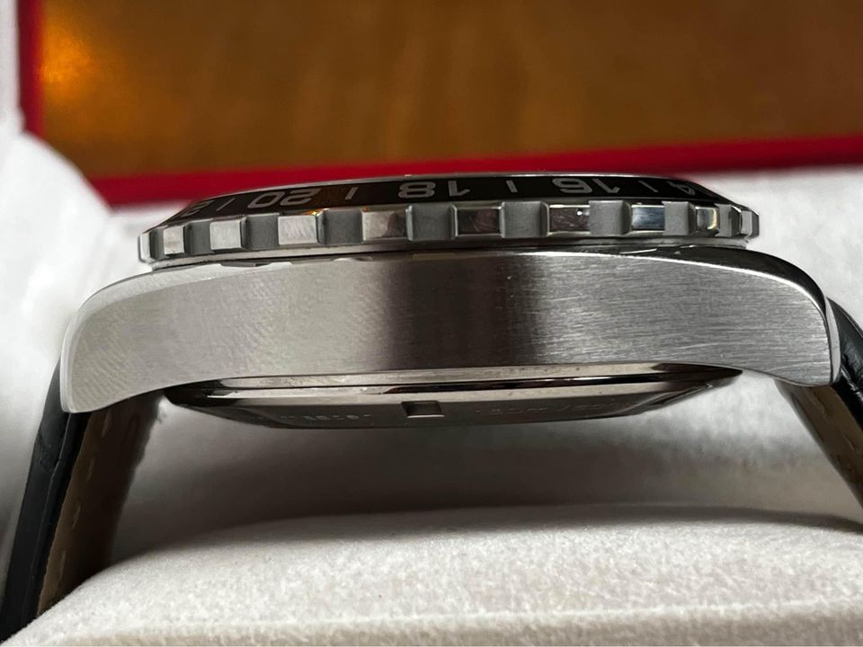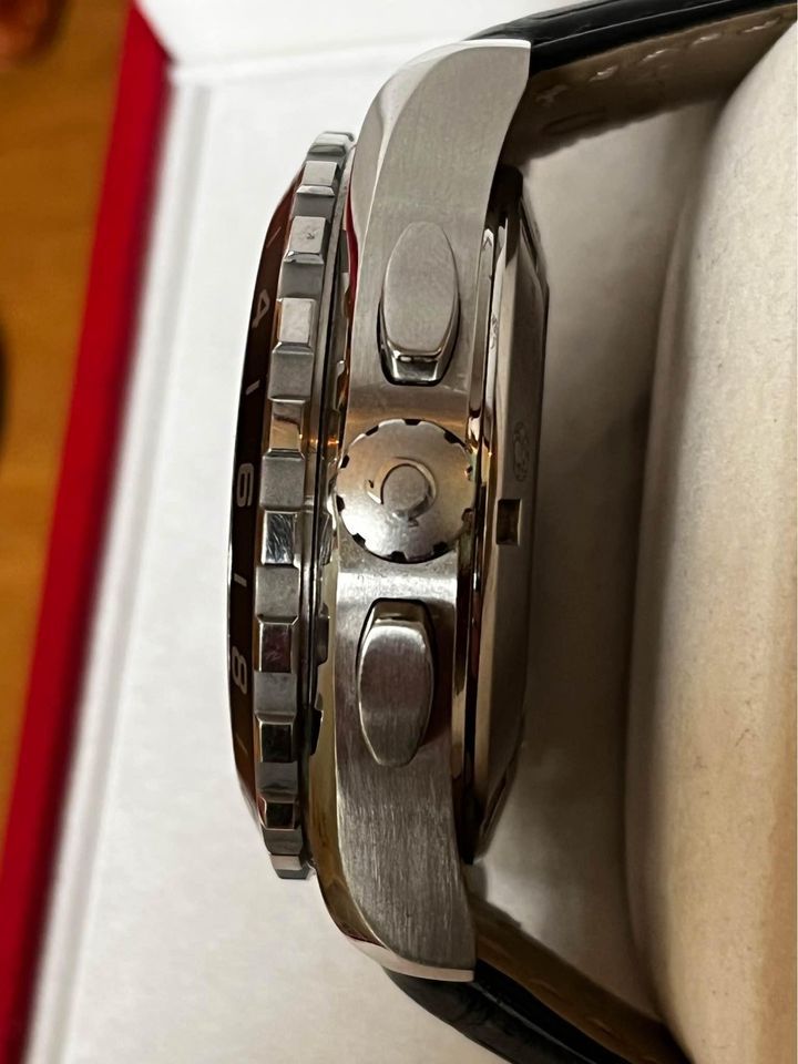 Thanks to the black alligator band and sporty chronograph dials, this watch is equally at home on your wrist while sailing on your yacht in a swimsuit, or when pitching to that senior executive while wearing a business suit. The 44mm case diameter is a perfect size for medium to large wrists.
