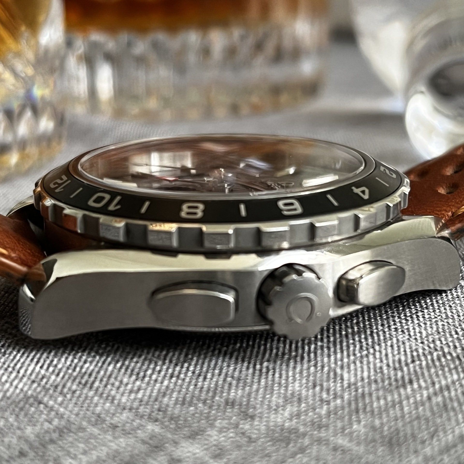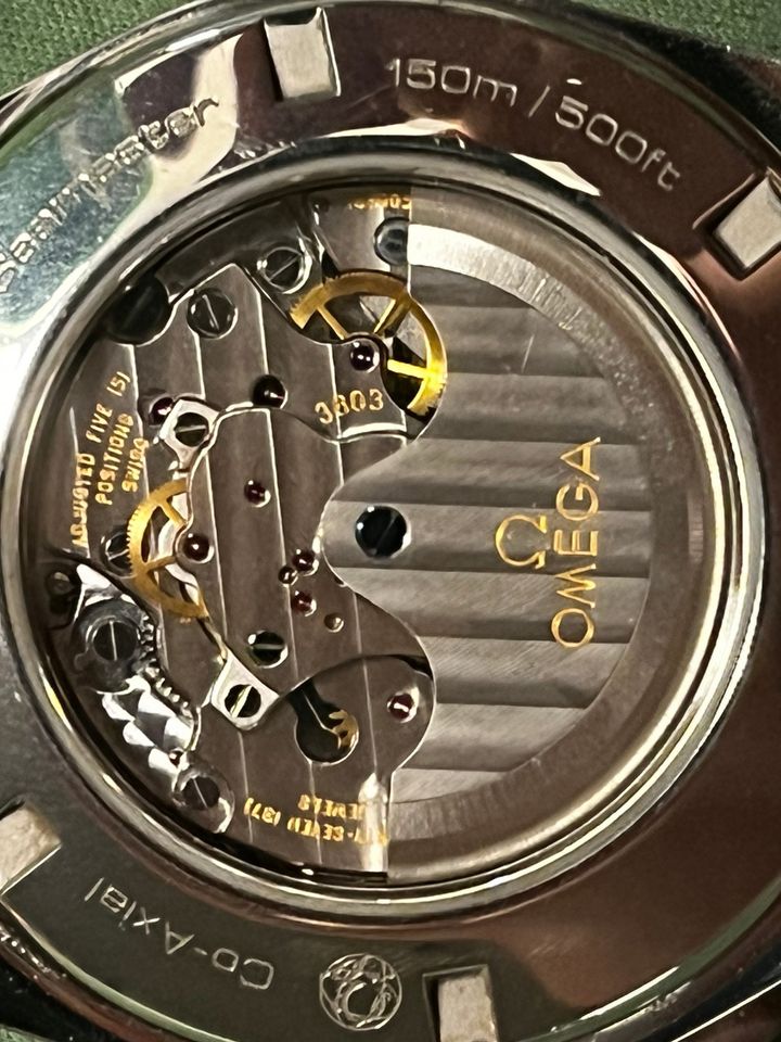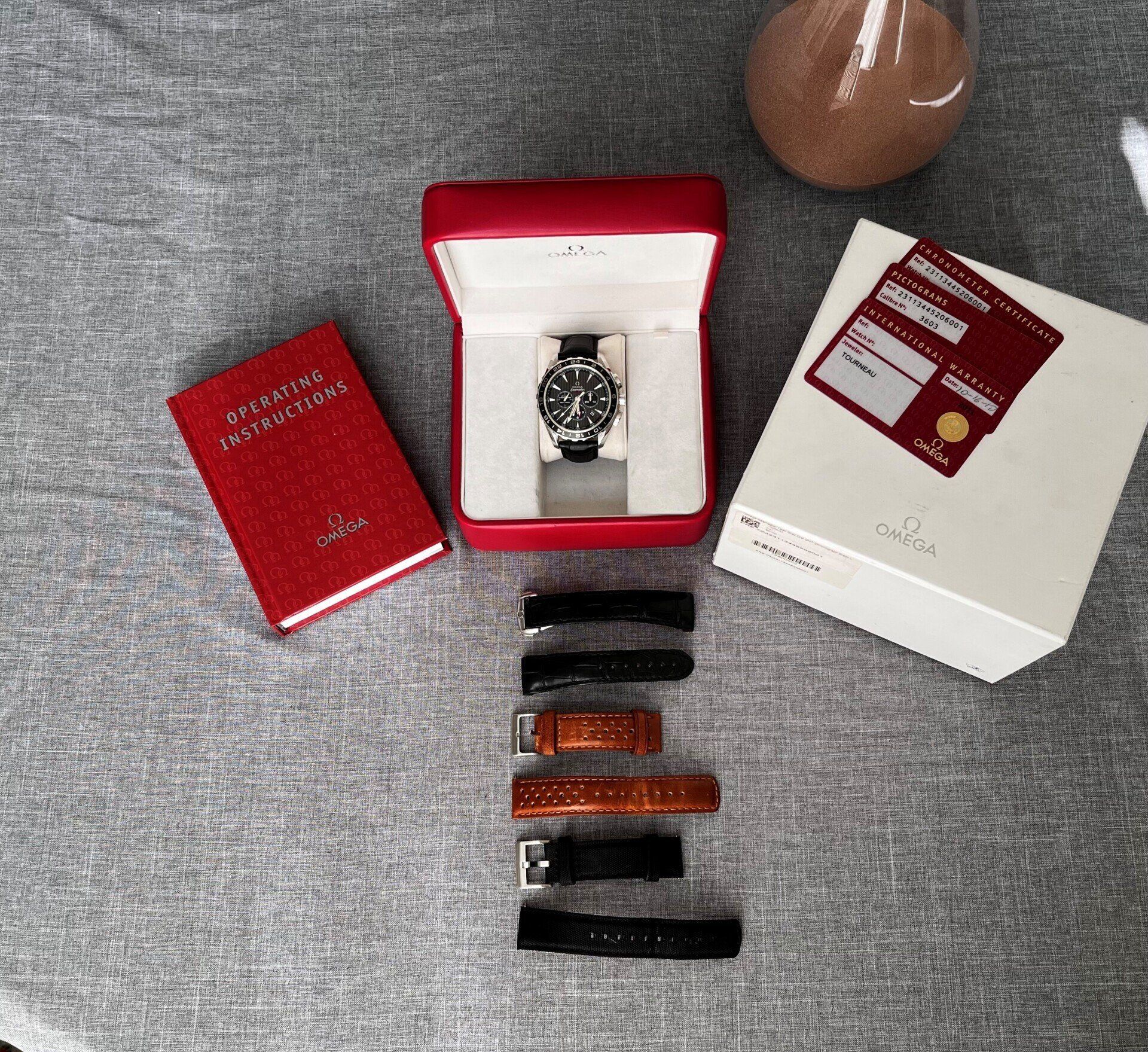 This time piece will be delivered as a full set with inner and outer boxes, instruction booklet, chronometer certificate, pictograms, and a dated but unsigned warranty card from Torneau. The watch was purchased in 2010. It will also include the factory Omega black alligator strap, a factory replacement Omega black alligator strap with aftermarket deployant clasp, a caramel Horween leather quick release strap, and a black sailcloth quick release strap.