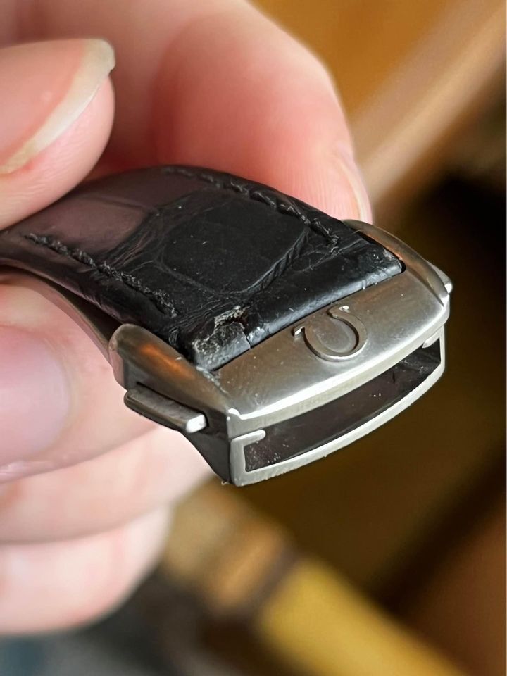 The case is in excellent form with only minor wear. The only flaw on the case to note is a small bezel ding near the 10:00 marker. The original alligator band does have a small tear near the deployant clasp. Detailed pictures of both instances are shown. I would put overall condition at 95% conservatively.