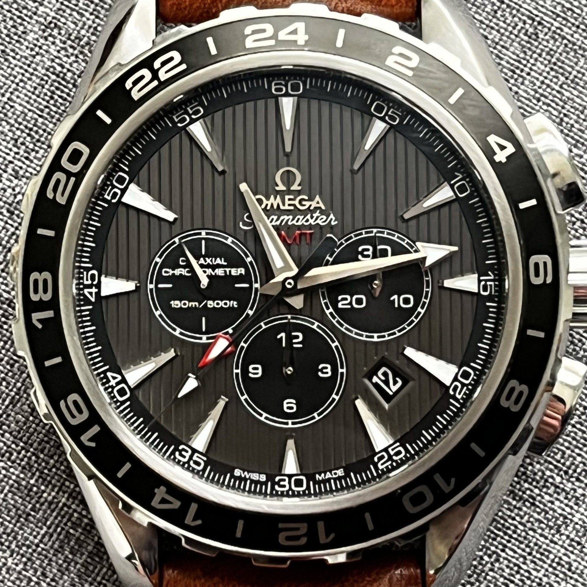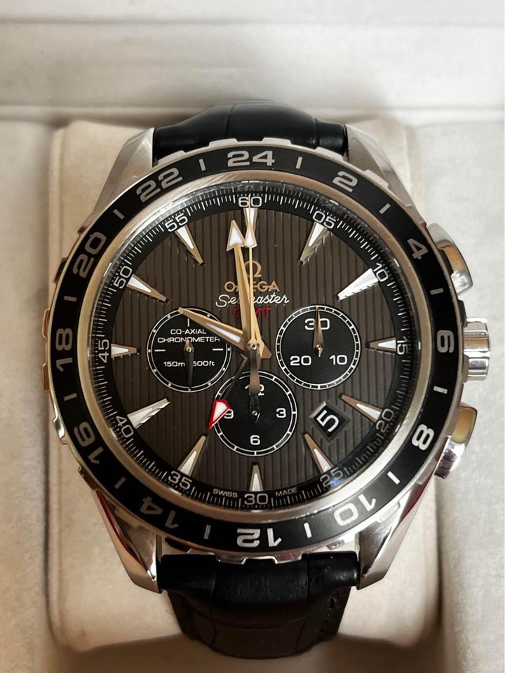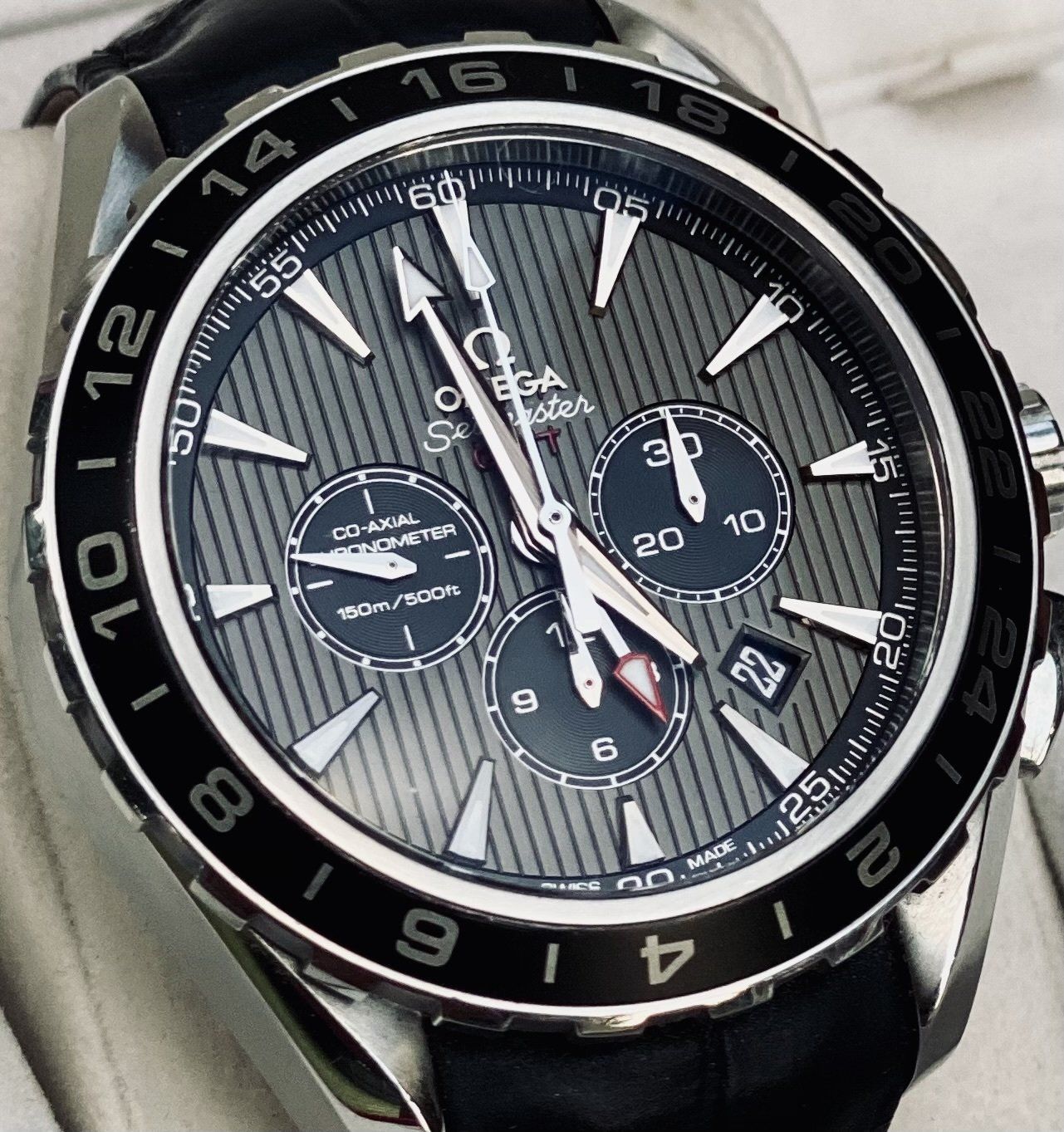 Up for sale is this beautiful Omega Aqua Terra 150m Co-Axial Chronometer GMT Chronograph