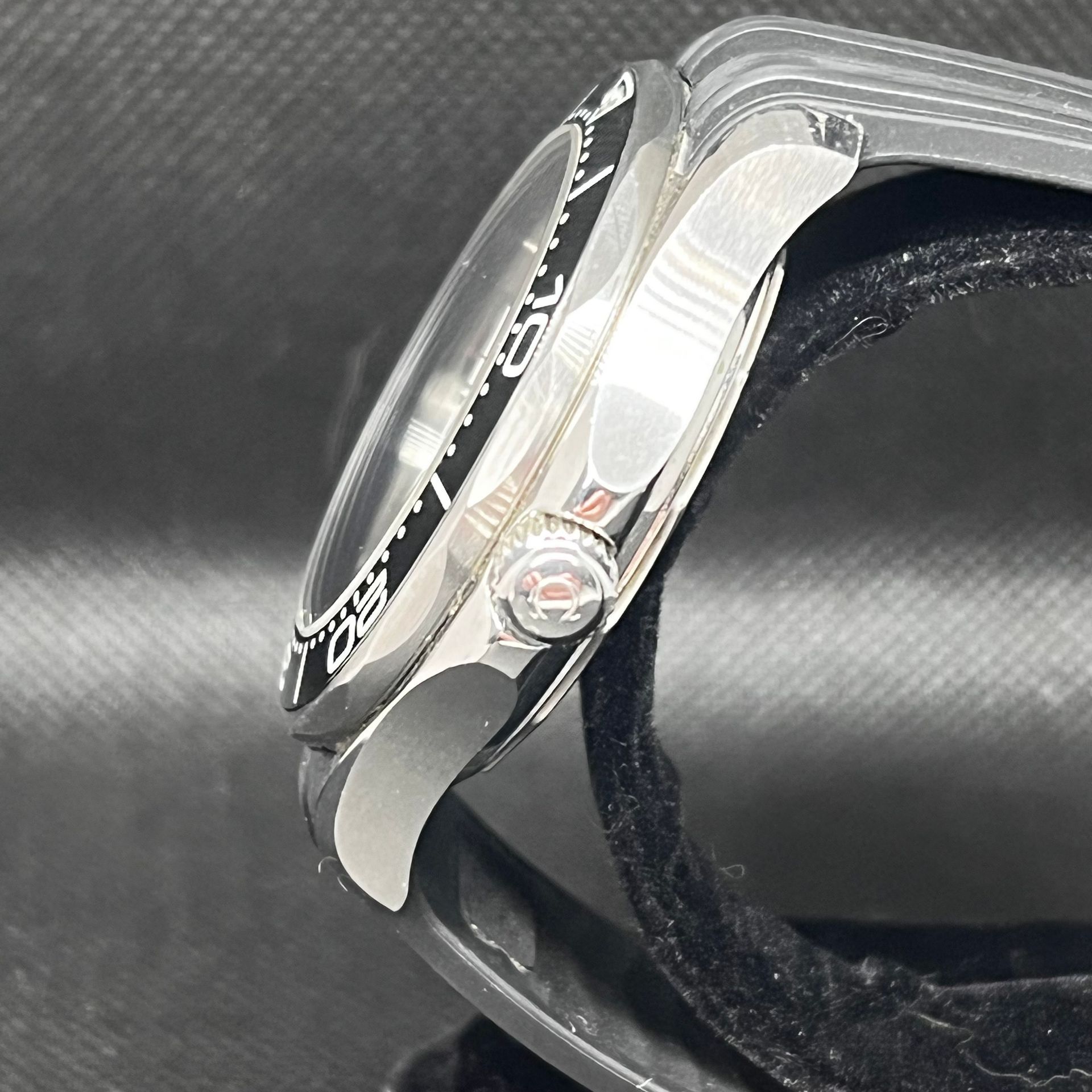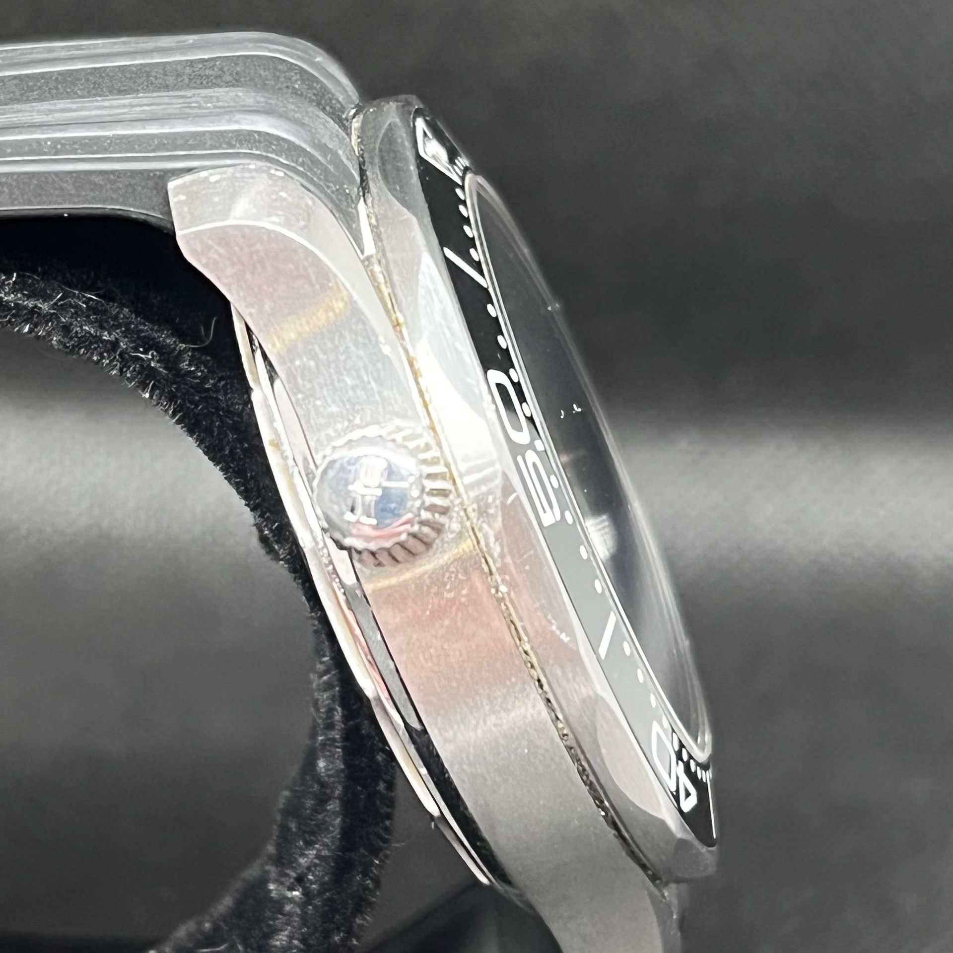 This 42 mm model is crafted from stainless steel and includes a black ceramic bezel with a white enamel diving scale. The dial is also polished black ceramic and features laser-engraved waves and a date window at 6 o’clock.