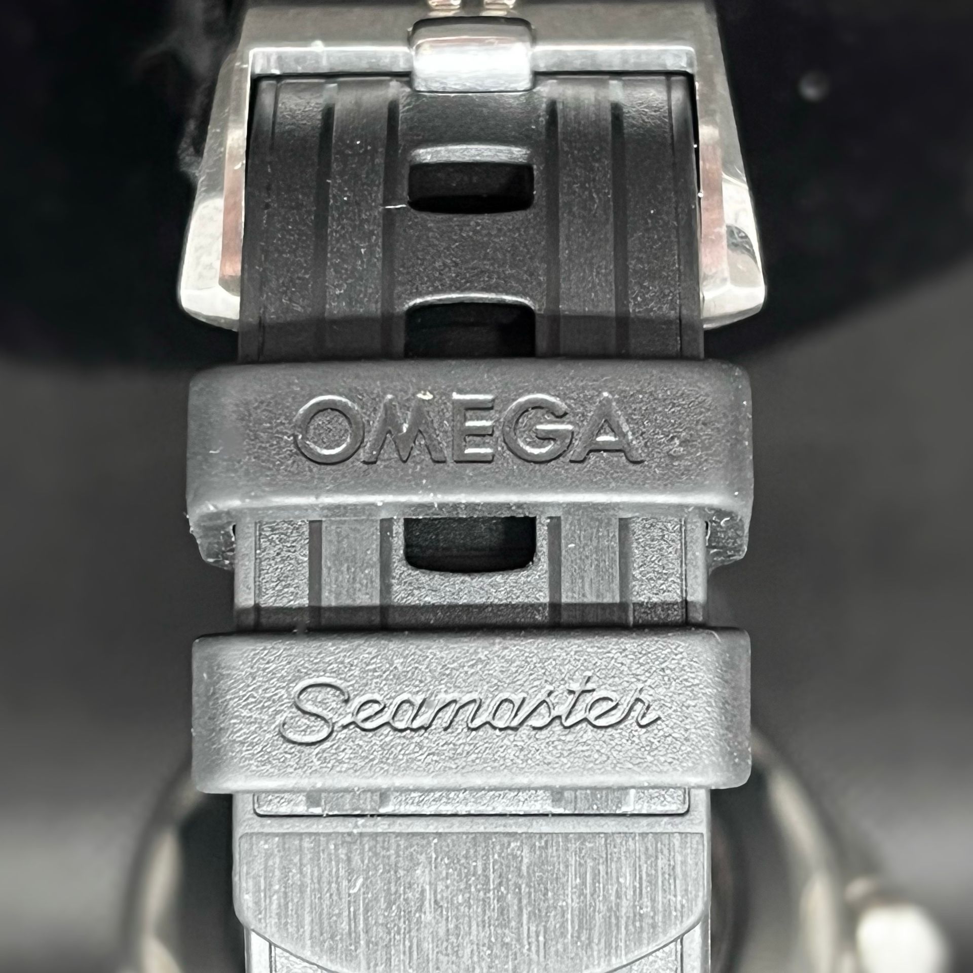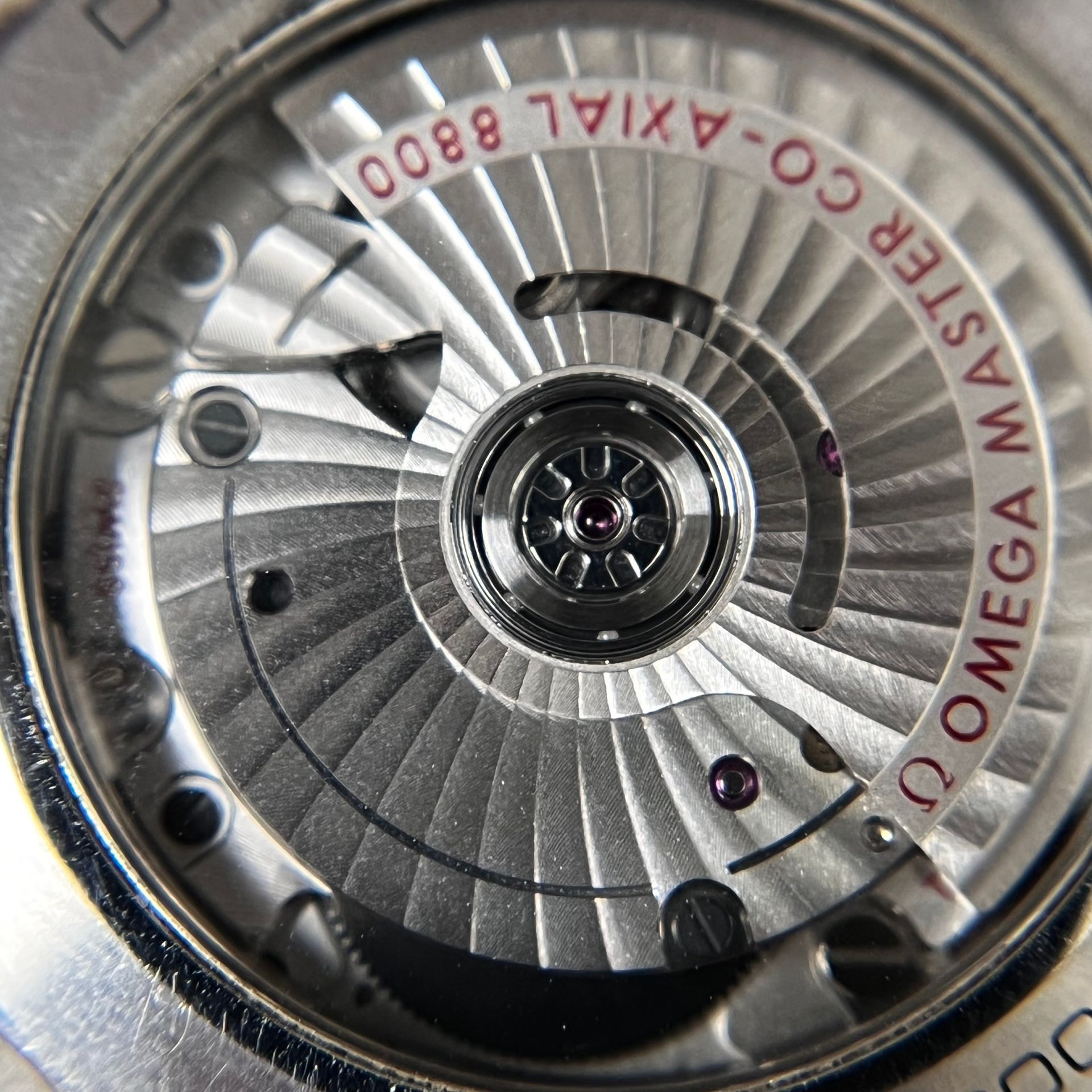 The watch is presented on a black rubber strap and is driven by the OMEGA Master Chronometer Calibre 8800, which can be seen through the sapphire-crystal on the wave-edged case back.